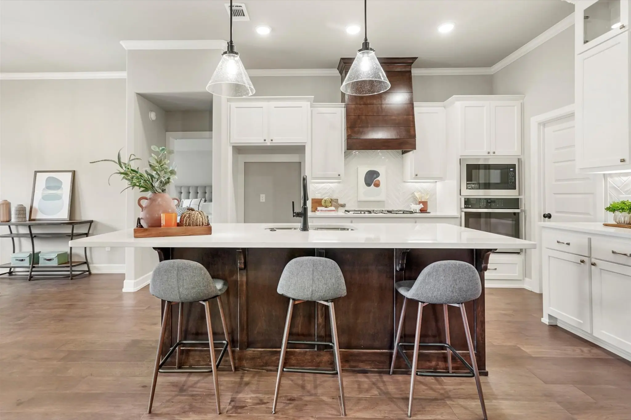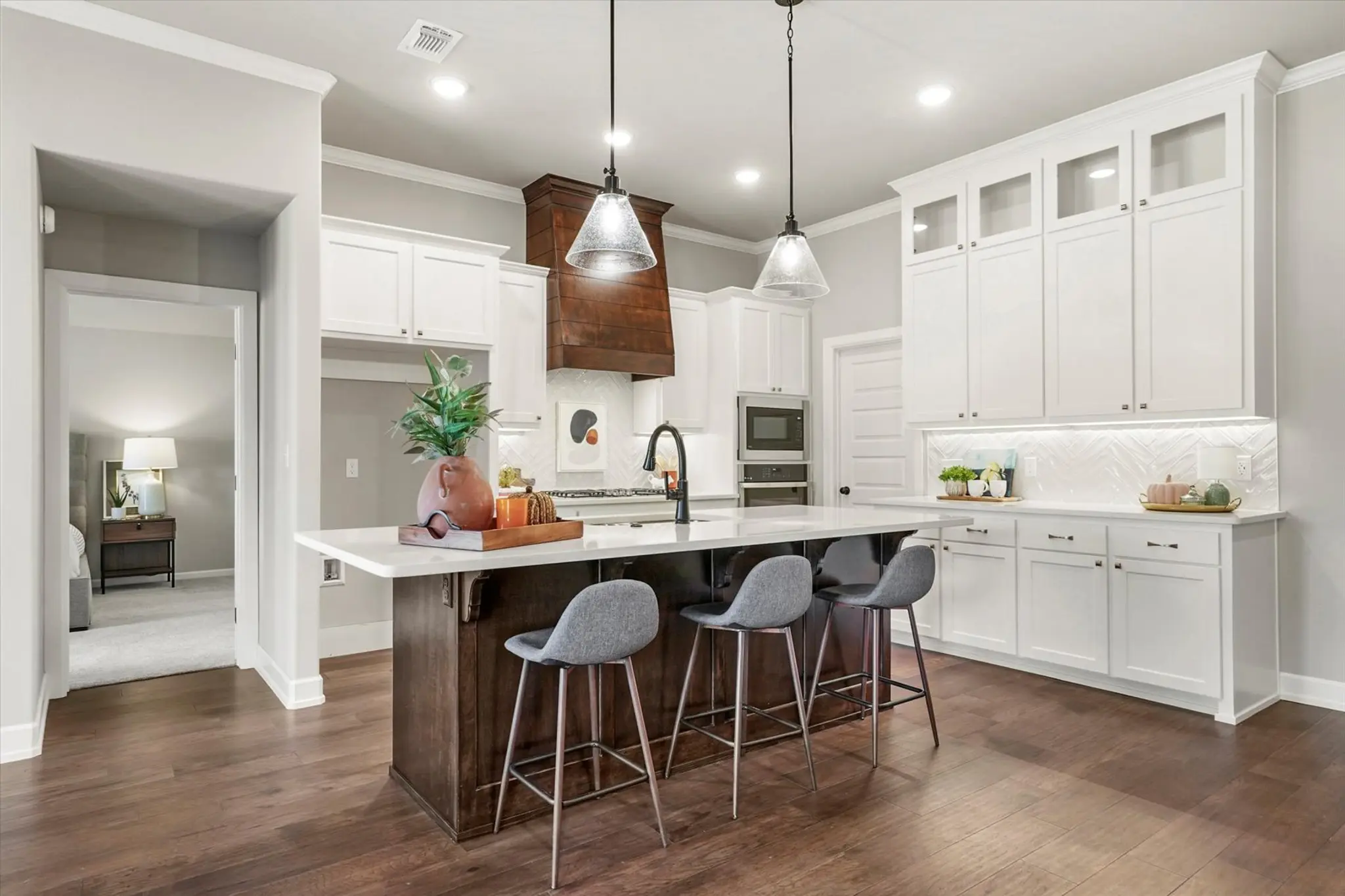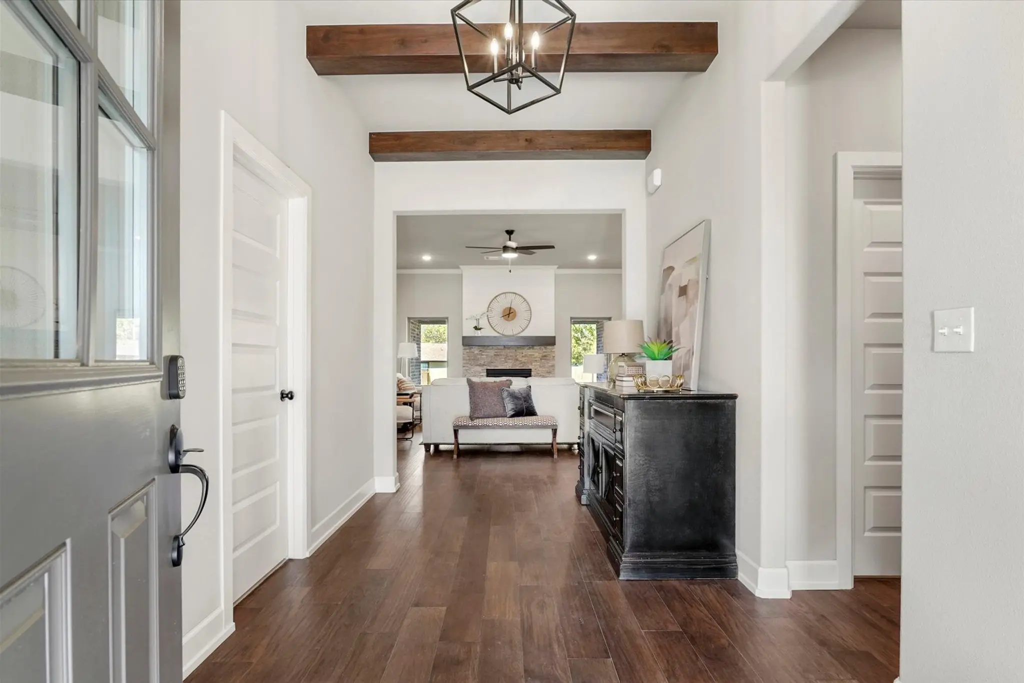 Fall in love at first sight with this beautifully crafted home in Creekside at Forest Ridge, where timeless curb appeal meets modern comfort. From the charming brick, stone, and wood-accented exterior to the warm, wood-beamed entryway, every detail invites you in. Inside, the open-concept layout features a spacious living room with a cozy gas fireplace, a designer kitchen with a large island and walk-in pantry, and a dining area perfect for gatherings. The private owner’s suite offers a spa-like escape with dual vanities, a soaking tub, glass shower, and a walk-in closet with direct access to the laundry room. With four bedrooms—including a versatile front room ideal for a guest suite or home office—and a covered patio out back, the Hawkins Pt is designed for how you live today.